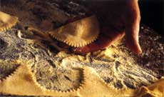 Place a sheet of pasta on a lightly floured work surface. Place 1/2 teaspoon of filling every 3 inches down the length of one side of the pasta sheet. Lightly brush the other side of the sheet with the egg wash. Fold the sheet in half length-wise and press with your fingers along the edges' to seal. Cut around each lump of filling with a pastry wheel into half moon shapes. Set aside on a lightly floured dish towel until ready to cook.