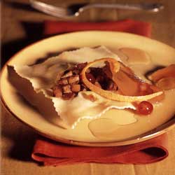 These large ravioli make a sumptuous first course when served singly. Mostarda is a is a mixture of candied fruits preserved in a liquid of sugar and mustard-flavored oil. You can find it in gourmet Italian food stores packed in jars or beautifully decorated tins.