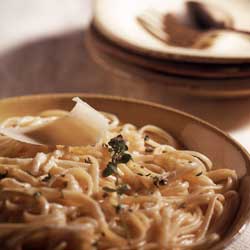 In a saucepan, combine the cream, fontina, Gorgonzola, and mozzarella. Warm slowly over low heat, stirring constantly, until cheeses have melted. Add the thyme, season with salt and pepper, set aside, and keep warm.