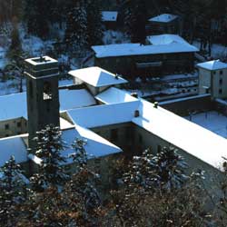 When you arrive at Consuma, those coming from Florence will see the red and white signs of the CAI no. 00 path on the right of the state road. Following these signs in the car, take a narrow asphalt road that climbs until it reaches some small villas. After passing them, the road turns into a track. Leave the car here, put on your skis and set out, following the red and white signals. The route takes you into the wood and you immediately come to a crossroads with a tabernacle. Go right along the unpaved track that goes into the thick fir wood that cloaks the ridge. Carry on along here for about 2 km (there is no possibility of going wrong) until you reach the Croce di Ribona, where you leave the ridge track and go right along an unpaved track closed off by a bar. This immediately begins to descend (ignore a road to the right) and soon brings you to a junction near a metal shack. If you carry straight on, you descend immediately to the Consuma–Vallombrosa road, which has been closed by a landslide for the last few years and so is not maintained (the left branch take you across one of the most beautiful corners of the Forest of Vallombrosa to the abbey). If, on the other hand, you go left, passing in front of the shack, the route does a wide loop in the wood, running along a gentle, slightly rising path that gradually draws closer to the Fosso del Bifolco. After doing a wide semi-circle to the right around the head of the stream, you come to a junction. Here, going left, you rise quickly to the Vallombrosa–Secchieta paved road (maintained in winter). Taking the road to the right you go downhill, keeping above the stream until you come to another junction. From here all routes lead to to the Consuma–Vallombrosa road (not maintained in winter and excellent for cross-country skiing), but the one going off to the left is the most interesting; this takes in Metato and the Capanna Massa al Monte, finally joining the main road. The abbey of Vallombrosa is along here to the left. You can either return the way you came or along the Consuma–Vallombrosa road.