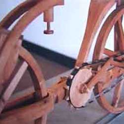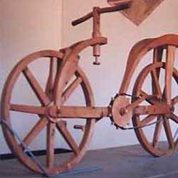 In 1986 a full-scale wooden replica of the two-wheeler (see picture) was built by Giovanni Sacchi, an Italian technical designer. And since then it has been shown at the Museo Leonardiano di Vinci (near Florence) as one of Leonardo's works.